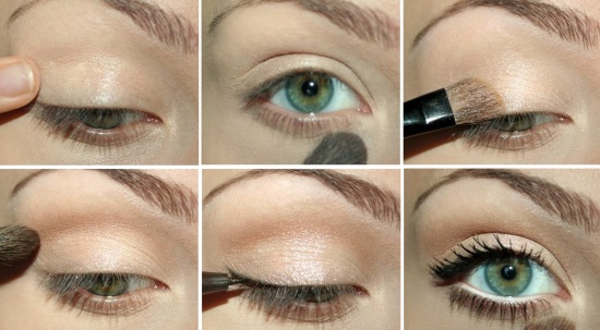 Переходя к макияжу глаз, нужно помнить, что можно использовать тени только спокойных пастельных тонов, подобранных в цвет глаз. Это бежевые, коричневые или серые оттенки. Наносит их следует, создавая плавный переход между цветами. Самый светлый оттенок наносится на внутренний уголок глаза, по направлению к внешнему оттенок становится темнее, границы изменения цвета теней обязательно должны быть растушеваны.
