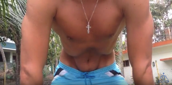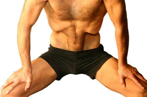 - Надавливая ладонями на бёдра, напрягается область живота с тем, чтобы средний участок мышц пресса выделился вперёд. В результате в области пупка должен появиться твёрдая продольная выпуклость из напряжённых мышц.