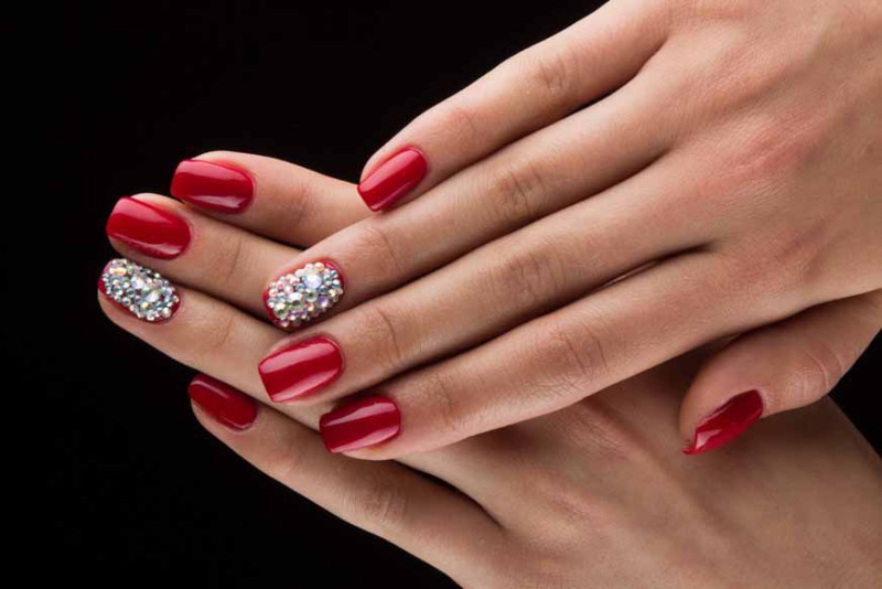 Красивый праздничный маникюр 2021-2022 невозможно представить без декоративных элементов. Белый жемчуг на алом или вишневом покрытии придает образу оттенок аристократизма. Популярный дизайн ногтей со стразами стильно представлен в красно-белом исполнении. На акцентные ноготки наносят стразы красного или белого цвета в зависимости от фона.