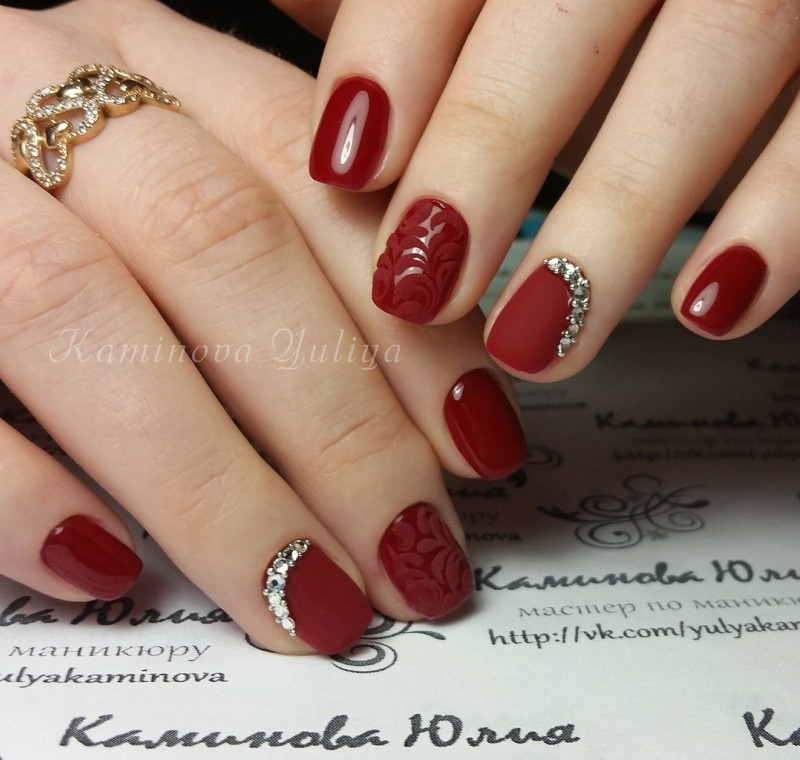 Красный всегда был признаком страсти, гармоничен с однотонным и на острой форме. Добавляют элегантную изюминку ажурные узоры, либо черная паутинка.