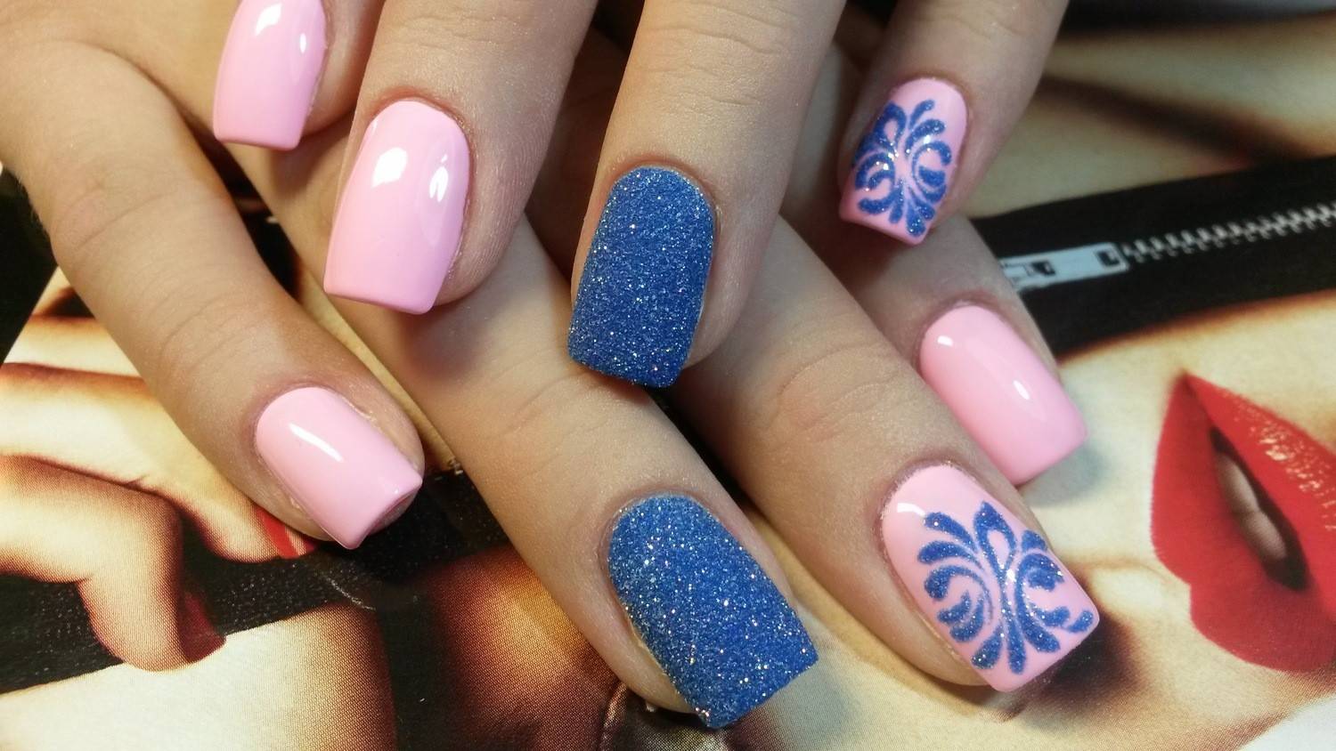 Актуально будет добавить рисунки геометрических фигур, птичек или белый горошек. Невероятно красивый дизайн можно получить, если покрыть все ногти матовым лаком, а на безымянный палец и мизинец нанести блестки. Такое оформление ноготков сегодня можно часто увидеть на фото голливудских звезд.