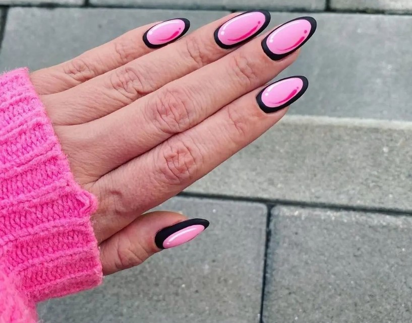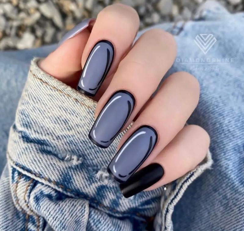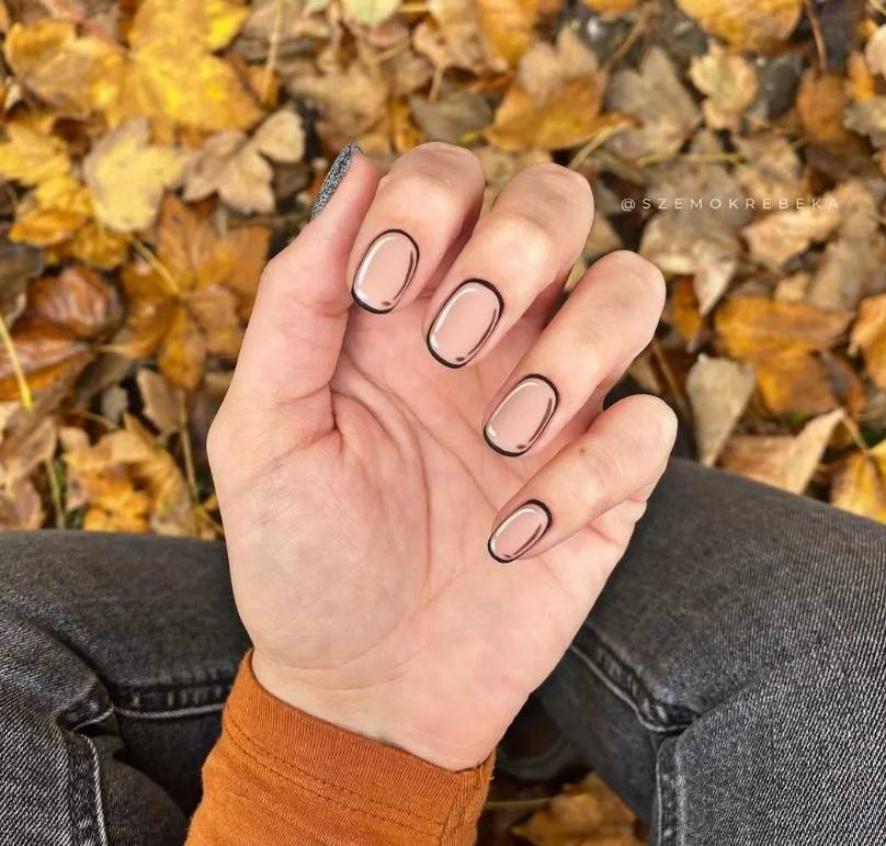 - Просушить его, а затем удобной кистью черным лаком обвести ноготь по контуру. Если ногти сделаны в форме квадрата, но у свободного края обводка должна быть квадратная, если в форме овала — овальная и т.д.