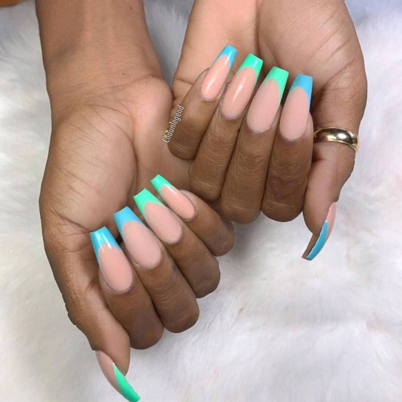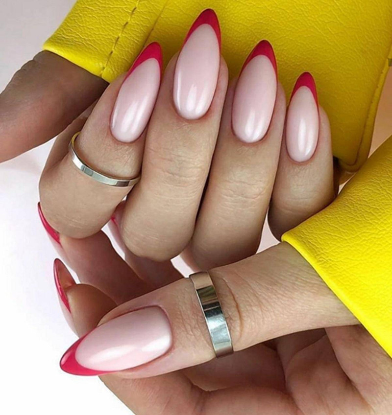 - И еще один вариант со сплошной заливкой — заменить яркими красками как лак для основы, так и лак для кончиков. Таким образом, можно создавать нежный и пастельный французский нейл арт, готический или очень нарядный.