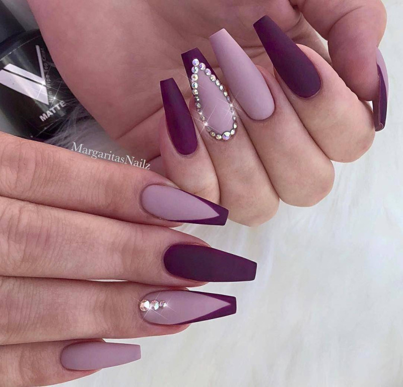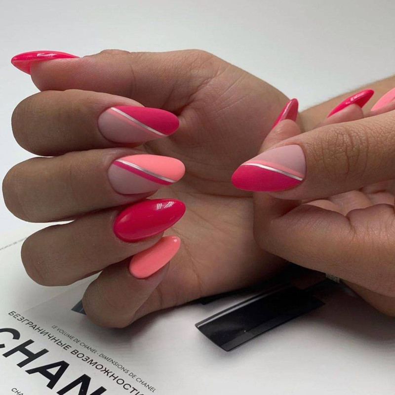 В нём используется несколько схожих тонов с разными текстурами, в том числе и омбре. Комбинированный делают шеллаком, но вероятны и яркие варианты. Например, красный с розовым или малиновым.