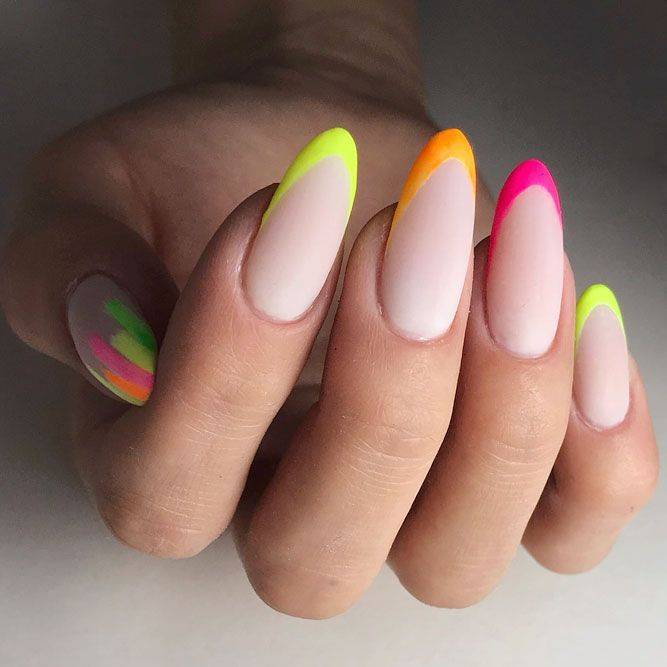 Цветной френч подразумевает замену классической палитры на более яркую, таким образом можно получить широчайший простор для экспериментов.