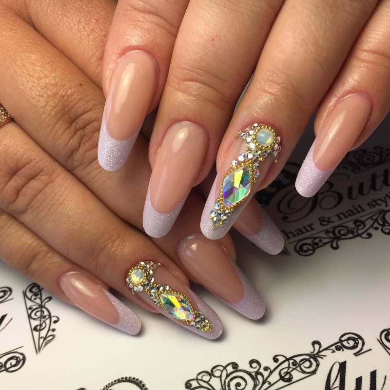 Сделать ноготки яркими и неповторимыми помогут разноцветные блестки или стразы, которыми можно усыпать основу ногтя или кончик. Эта вариант выполняется пошагово в соответствии с приведенной выше схемой, затем на недосушенный лак приклеивают блестки или стразы.