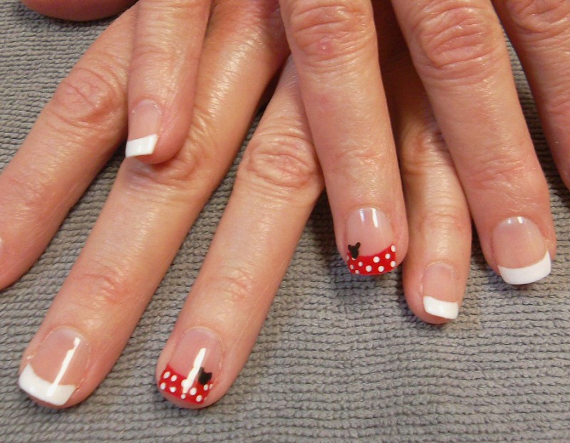- На ноготке с яркой линией “улыбки” при помощи дотса сделайте маленькие белые точки. На уголке тонкой кисточкой черным лаком нарисуйте маленькое силуэт Микки Мауса.