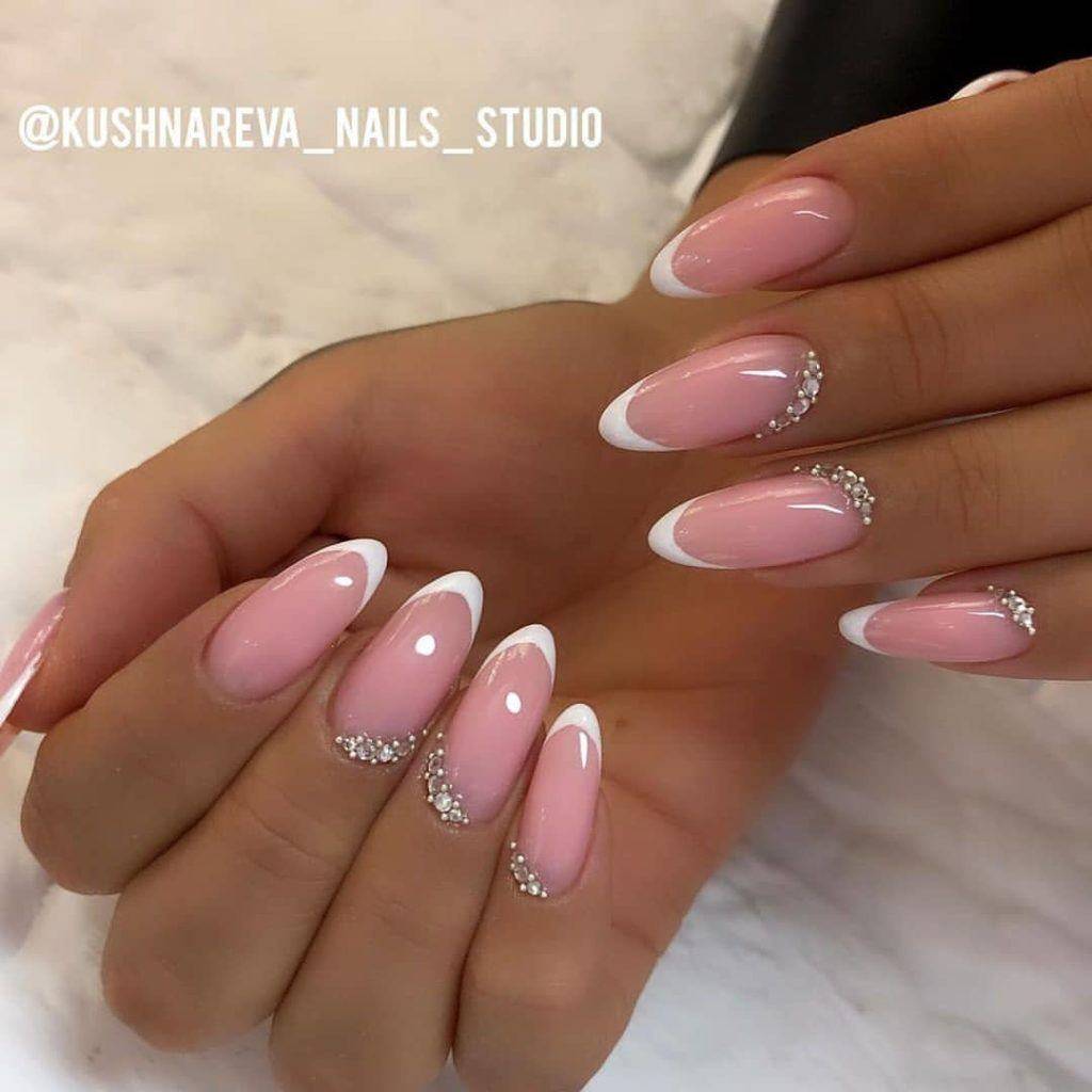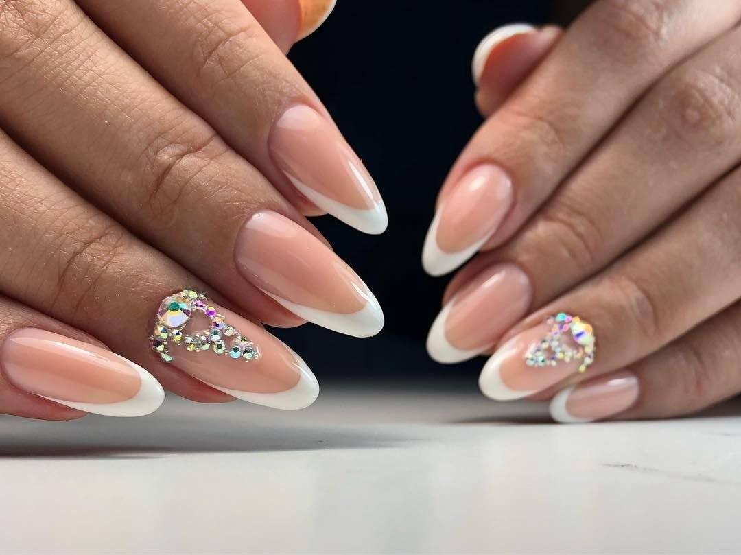 Нередко белый френч дополняют мелкими стразами на безымянном пальце, что добавляет дизайну нежности и женственности.