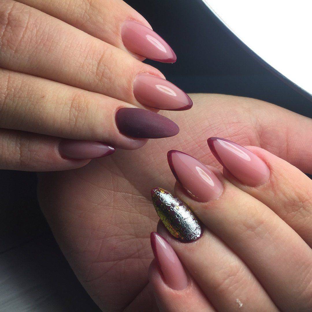 В нём используется несколько схожих тонов с разными текстурами, в том числе и омбре. Комбинированный делают шеллаком, но вероятны и яркие варианты. Например, красный с розовым или малиновым.