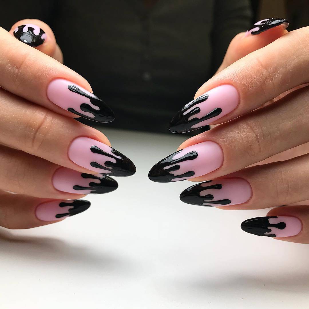 Треугольный достигается при помощи трафаретов, липких лент, красок, дотса. Напоминает треугольник, остальное пространство закрашивается. Красиво сочетается с одним или двумя цветами. Зрительно делает ногти более длинными и острыми.