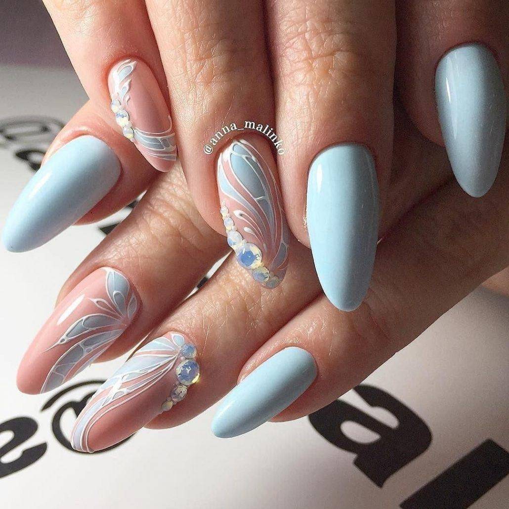 Декор для длинных ногтей подбирается исходя из основного оттенка, сезона и тематики нейл-арта. Одинаково красиво на длинных ногтях выглядит геометрия, ажурные узоры, дымка, выкладка стразами и т.д. Что касается флористики, то акцент сместился с ярких слайдеров на утонченные узоры в темном цвете с бутонами и листочками. Также красиво смотрится флористика с помощью аэрографии. Узор получается нежным и плавным.