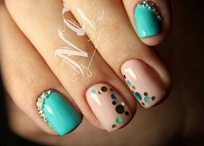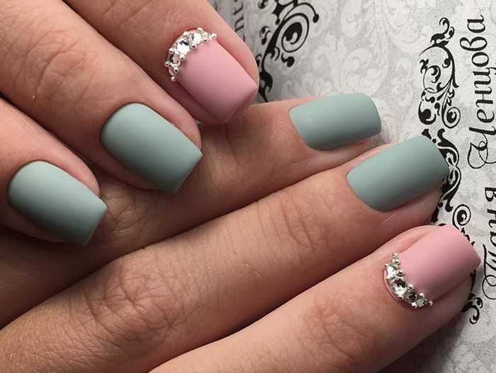 Очень благородно выглядит оформление ногтей матовыми лаками нежно-розового и тёмно-мятного цветов, в качестве декора – полоски из страз и бульонок у основания безымянных ногтей.
