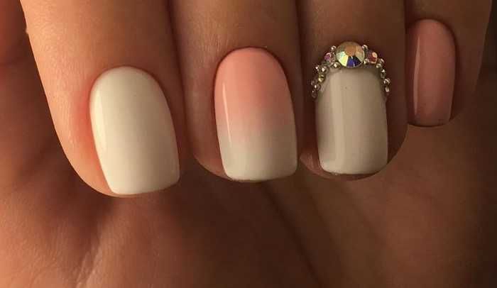 На фото ниже представлено бело-персиковое омбре, основание безымянного ногтя выложено одной крупной и двумя маленькими стразами, а также бульонками.