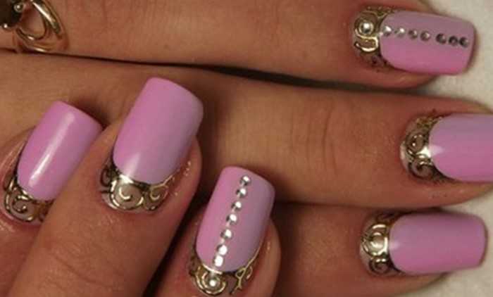 Разнообразие рисунков и узоров розового маникюра с золотым дизайном, делает ноготки аккуратными. Золотистый сочетается с розовым в технике френч или лунного дизайна. Подходит в офис и на выход.