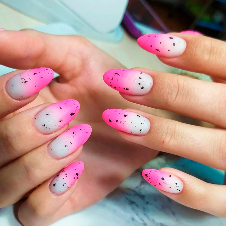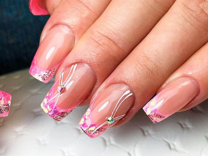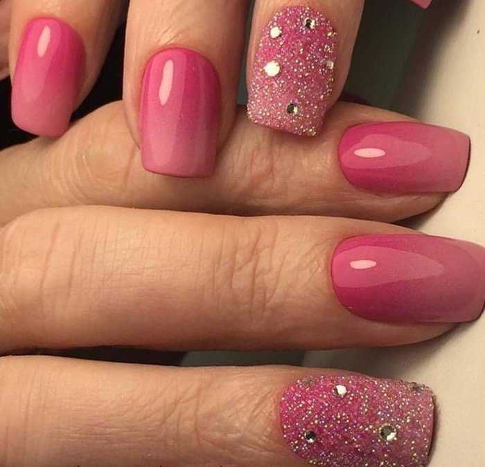 Маникюр розового цвета с омбре и градиентом можно оформлять в похожих оттенках, и разных. Наилучший эффект достигается выбором контрастных цветов. Дизайну можно украсить блестками, небольшой полоской прозрачного лака или стразами.