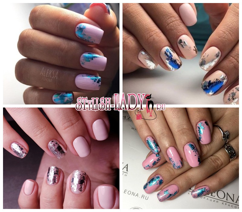 - Самым эффектным и модным выглядит вариант с рваной фольгой. Ее хлопья наносятся как будто в случайном порядке, что придает динамику. Серебро отлично гармонирует с холодными тонами лака, а более теплые краски сочетаются с золотом, медью и бронзой.