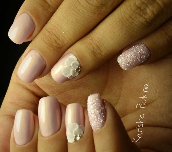 Розовый цвет традиционно используется для маникюра, так как имитирует естественный цвет ногтя. Наиболее частый вариант – это пастельные тона нежно молочного цвета.