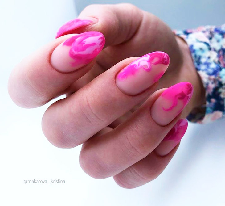 Ногти в мраморном стиле всегда выглядят беспроигрышно. Выполняется в разных оттенках розового. Красивые и аккуратные переливы делают акцент на ухоженных руках и завершают образ.