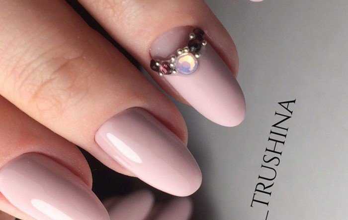 Стразы и бульонки могут располагаться и на всех ноготках, только в меньшем количестве – достаточно нескольких перламутровых или цветных элементов и вариант для вечернего выхода готов.