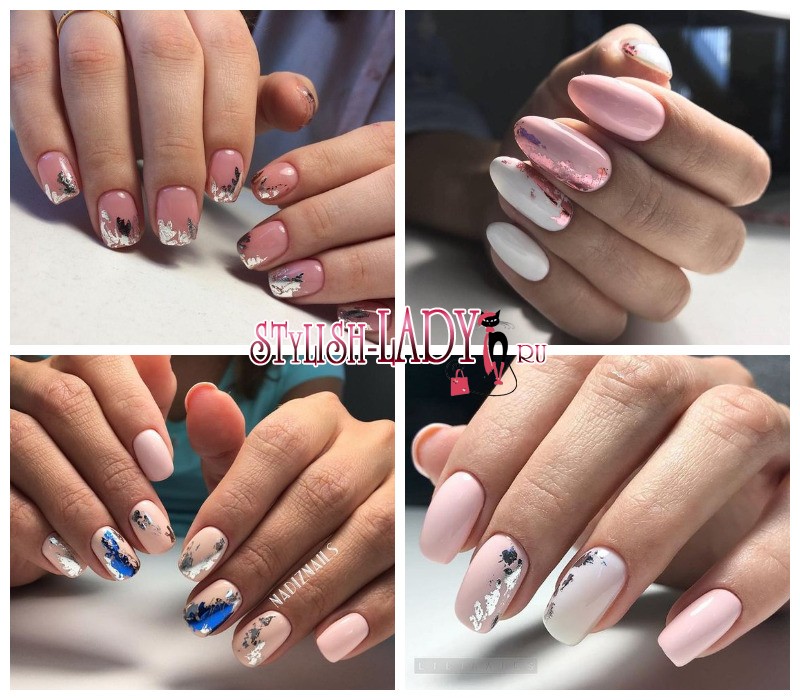 Что касается выбора фольги, то она может быть серебряной, золотой, медной, бронзовой или даже разноцветной, голографической или радужной. Все зависит от стиля маникюра. А от него уже, в свою очередь, зависит то, куда женщина будет «выгуливать» получившийся дизайн. Если это только скромные мазки фольги или декорирование одного – двух пальцев, то носить его можно смело и на работу (при отсутствии ограничений). Это может быть как повседневный вариант, так и более нарядный, праздничный, в котором будет намного больше блеска.