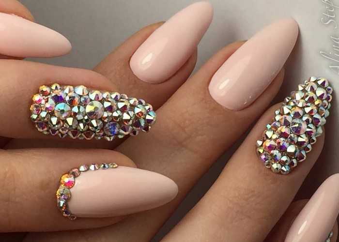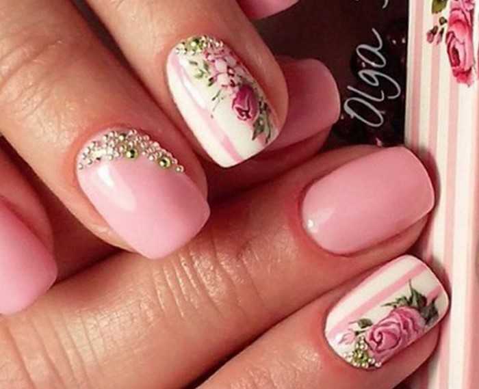 Ещё несколько удачных вариантов розового маникюра со стразами: