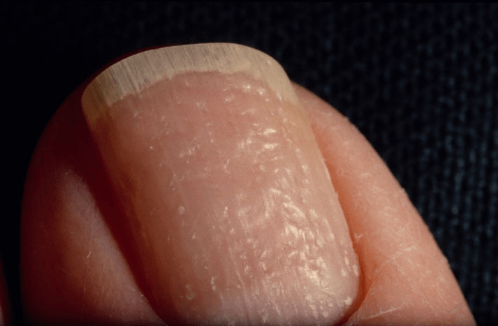 Внешне поверхность формой, цветом и текстурой не отличается. При ближайшем рассмотрении человек может увидеть мельчайшие ямочки, как будто пластину потыкали иголкой. В медицине патология даже получила соответствующее название – наперстковидная истыканность. К сожалению, болезнь появляется неспроста и практически всегда свидетельствует о наличии псориаза. В других случаях таким же симптомом сопровождаются экземы кожи, а также артриты суставов. Поищите у себя дополнительную симптоматику, характерную для перечисленных заболеваний, и не забудьте обратиться к участковому врачу.