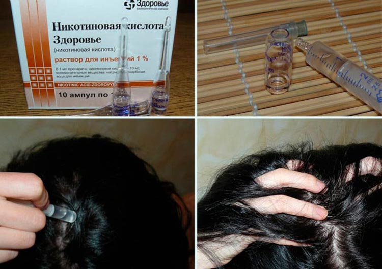 - Никотиновая кислота в ампулах берётся в чистом виде. Жидкость надо втирать массажными движениями после очищения локонов.