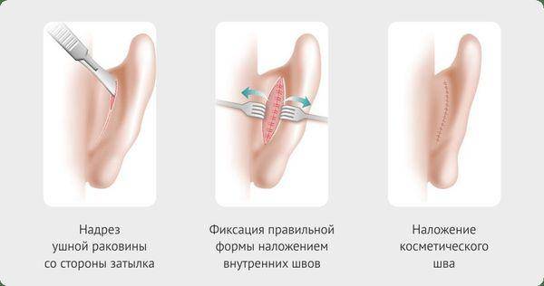 Все операции выполняются через мелкий надрез с задней части раковины, чтобы рубец не был виден стороннему взгляду. В редких случаях надрез делают с внешней стороны на изгибах ушной раковины, где его можно легко замаскировать.