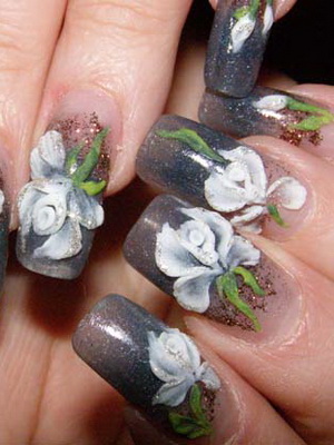 Популярный элемент маникюра – цветы, особенно розы. Для нанесения узора нужно воспользоваться дотсом и иголкой
