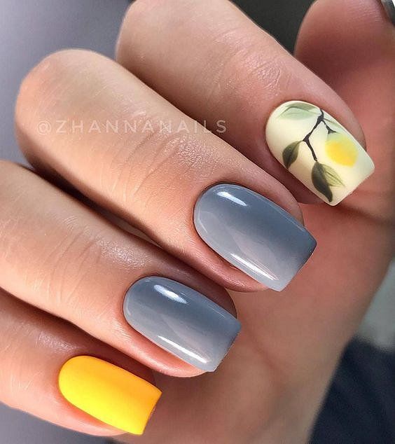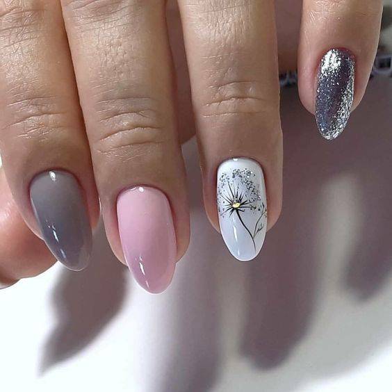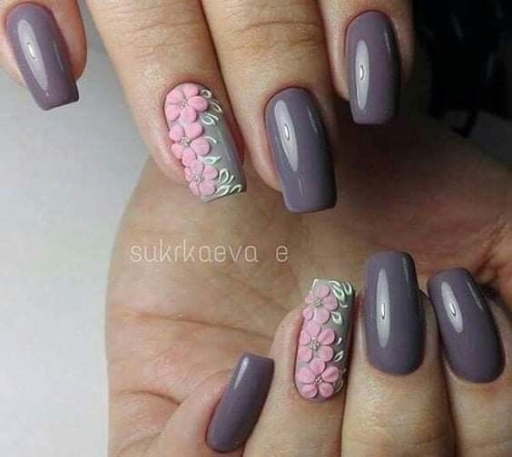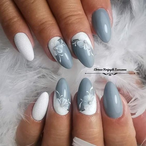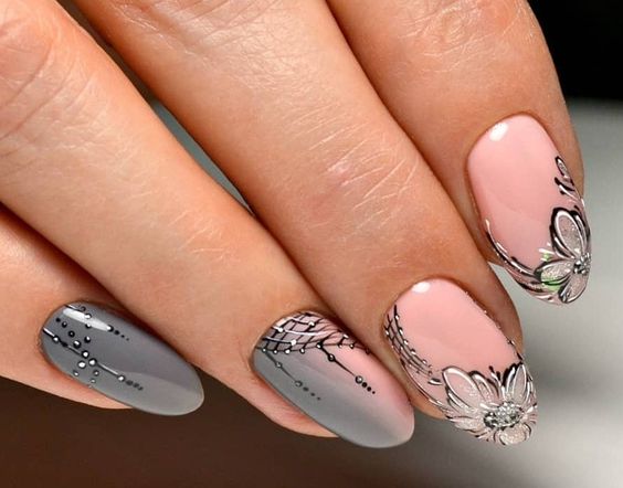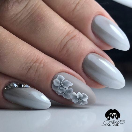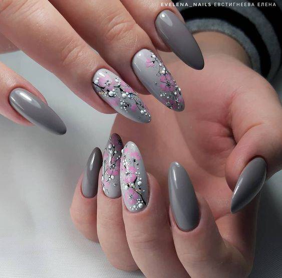 Серый маникюр с цветами