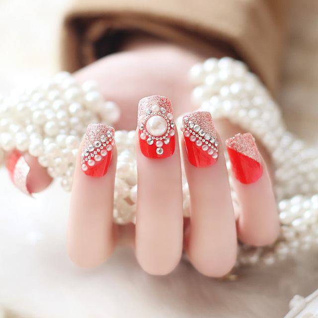 Самым популярным покрытием нарощенных ногтей является огненно-красный. Раньше ногти красного цвета использовались при создании образа женщины-вамп, но сейчас даже бизнес-леди предпочитают красный лак. Для того, чтобы разнообразить однотонный красный цвет, на нарощенную ногтевую пластину мастера маникюра добавляют оттенки других цветов, элементы декора или же наносят красивый рисунок.