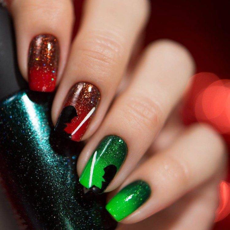 - Градиентный маникюр, при чем переходы могут быть как вертикальными, так и горизонтальными. Градиент – это не всегда переход одного цвета в другой, это может быть сочетание множества цветов, создающих настоящую радугу на ваших ногтях;