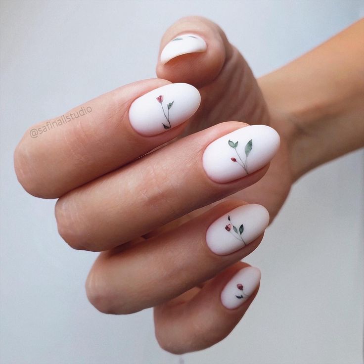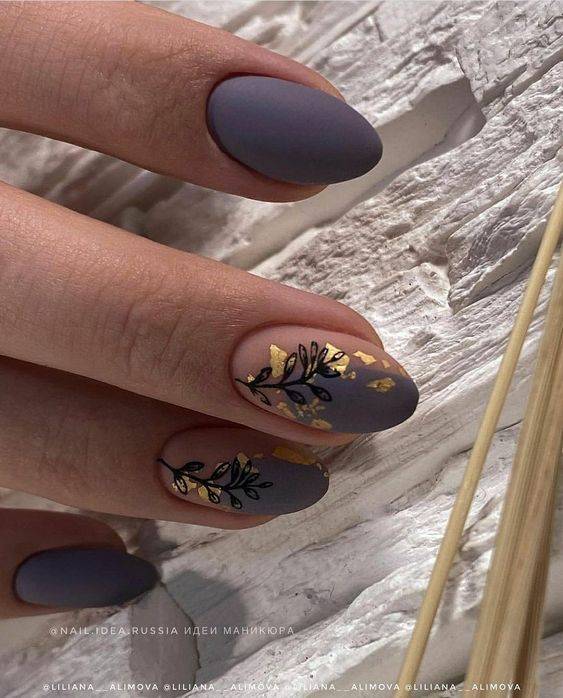 Рекомендую обратить внимание и на такой трендовый маникюр. Небольшие ненавязчивые рисунки на ногтях очень стильно смотрятся. Матовое покрытие в сочетании с золотом
