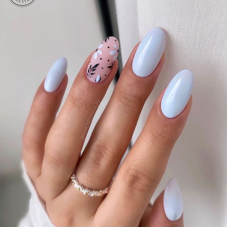 Акцентный маникюр – один из самых многообразных и ёмких, ведь он даёт возможность проявить всю свою фантазию и креатив. На каждой руке выбирают один пальчик (обычно безымянный) и создают нужные акценты. Проще всего сделать их с помощью необычного рисунка – цветочных принтов, фруктов, сказочных персонажей, абстракции, геометрии, граффити или кружев.