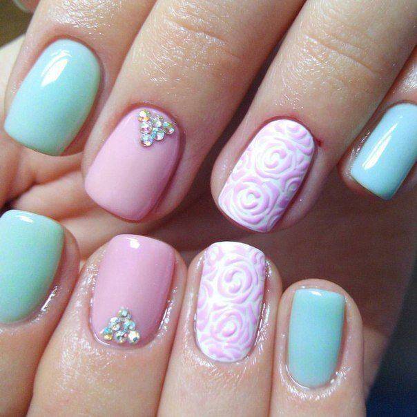 Красивый маникюр, нежный и очень женственный. Есть нюанс — крупные элементы желательно не закрашивать, так они будут выглядеть более эффектно и аккуратно.