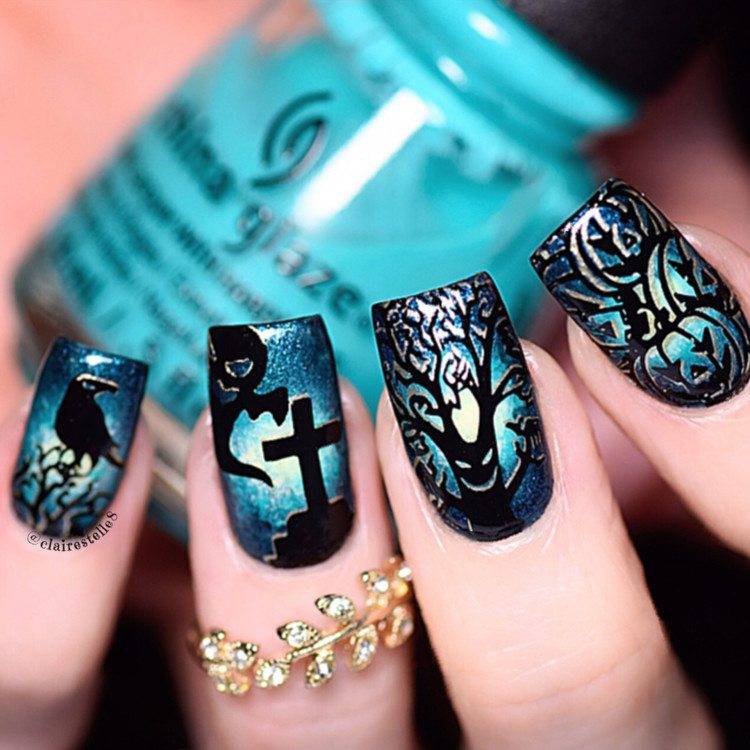 Покрытие ногтей стемпинг-картинками с разным содержанием. Такой дизайн можно сделать за считанные минуты, а выглядит он очень эффектно.