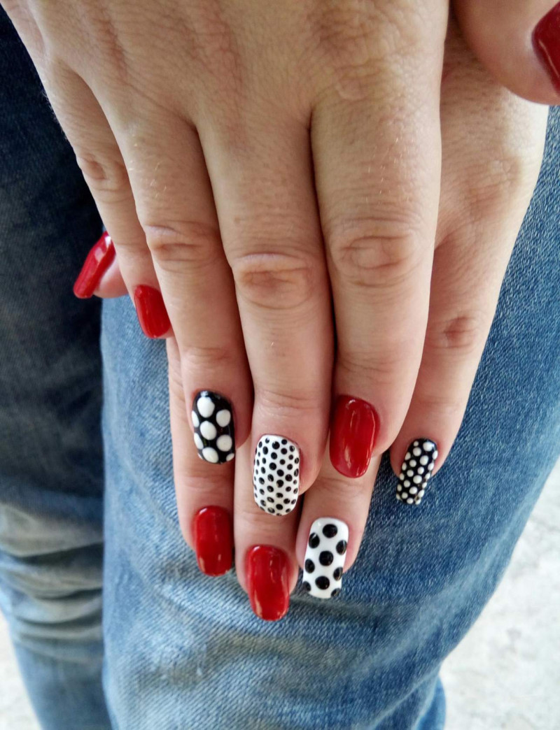 - Геометрический. Ногти украшают кружочки, геометрические фигуры, полосочки. Такой маникюр – идеальный вариант для офиса;