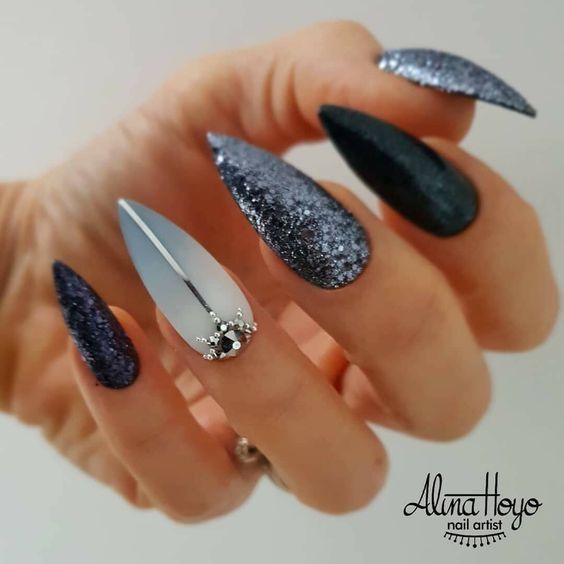 Маникюр, поднимающий настроение. Выполняется просто, но эффект вдохновляет. Глиттер можно брать любого оттенка. Однако тёмные блёстки на сером впечатляют больше.