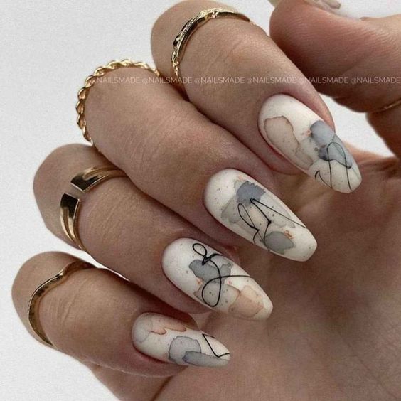 Мраморный nail-арт — удачный выбор не только для чёрного или белого. В сером исполнении он также великолепен, поскольку этот цвет содержит в себе все базовые оттенки. Мраморный серый дизайн — тёплый, но колоритный.