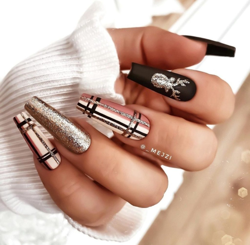 Клетка и олени — тема уютного домашнего зимнего вечера, реализованная с вызовом, за счет длины и формы ногтей.