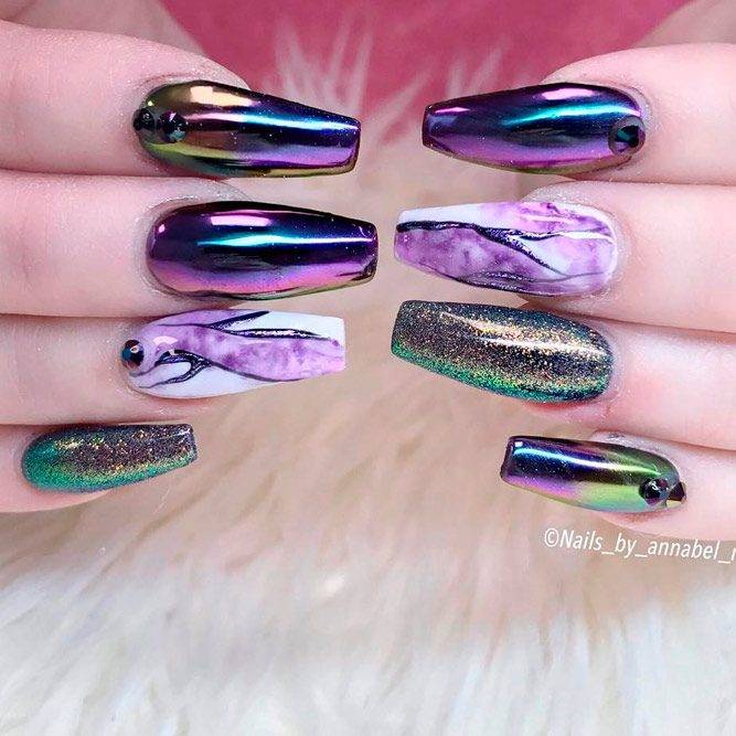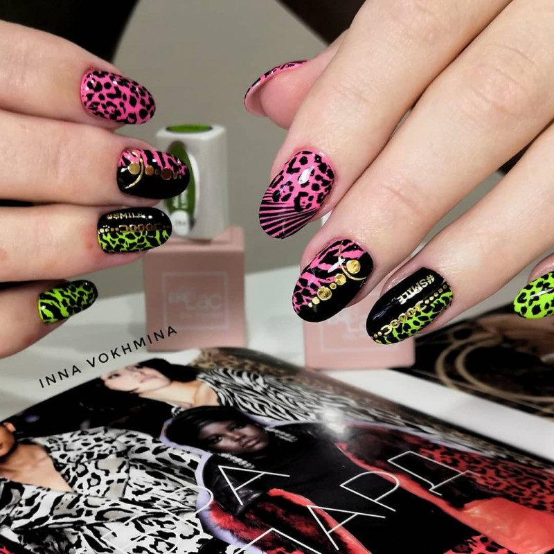Дизайнеры нейл-индустрии рекомендуют сделать маникюр с оттенками, которые ассоциируются с этим благородным хищником: красным, оранжевым, металлическими, черным, зеленым, синим, которые подойдут не только на длинную форму ногтей, но и на короткую.