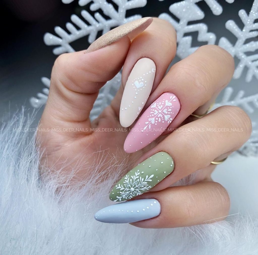 В этом праздничном Новогоднем сезоне, минималистичный дизайн прекрасно впишется в любого цвета Новогодний наряд. Очень стильно и легко будут смотреться пастельные цвета с небольшими акцентами в виде рисунка снежинки, нескольких аккуратных страз или каплей блесток.