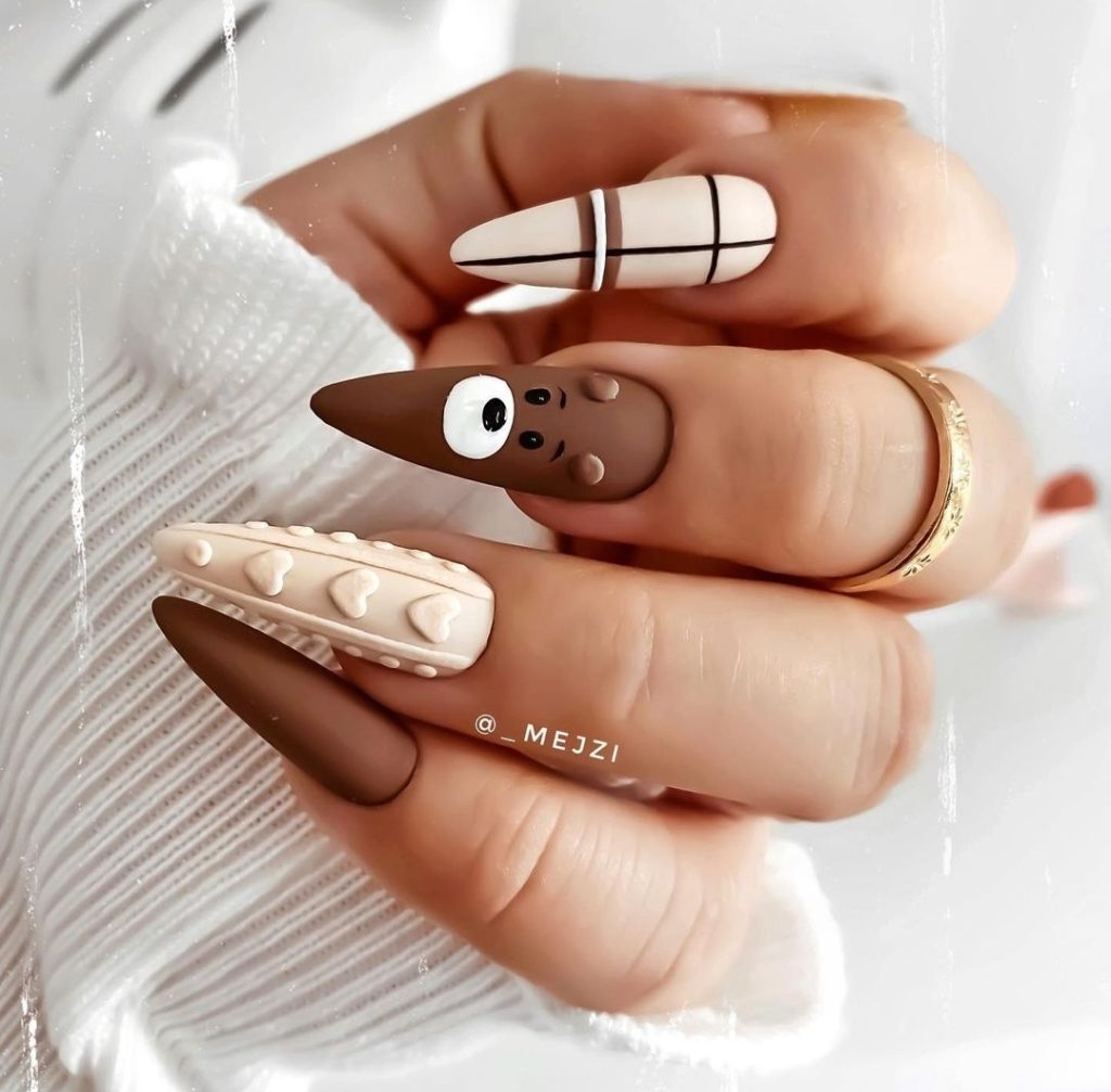 Здесь есть и леденец, и печенька, и вязаный дизайн ногтей. Такой дизайн отлично подойдет смелой молодой девушке.
