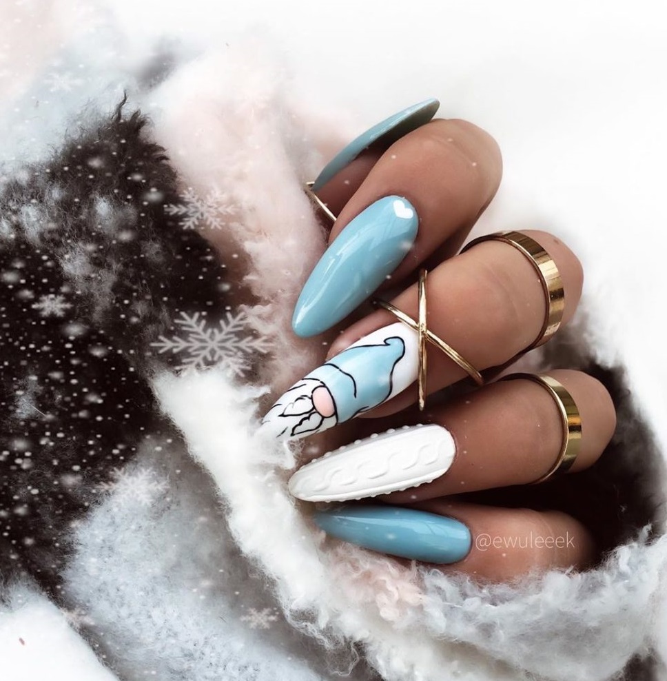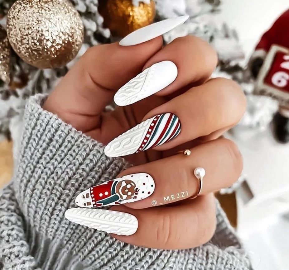 Новогодний дизайн ногтей с Дедом Морозом, вязаным узором и блестками выглядит изящно и празднично. Белые и красные оттенки будут дополнять друг друга, создавая гармоничный рисунок.