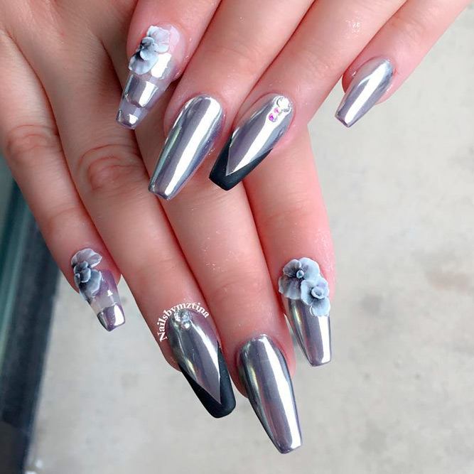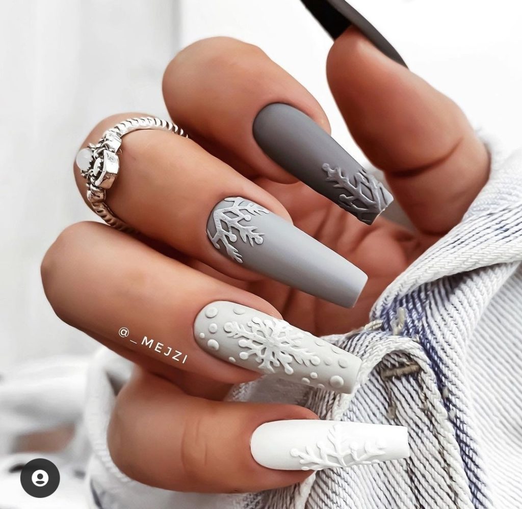 Матовые ногти формы «балерина» в 5 оттенках серого никому не покажутся слишком вульгарными. Площадь ногтя позволяет сделать крупный матовый дизайн стилизованными снежинками.