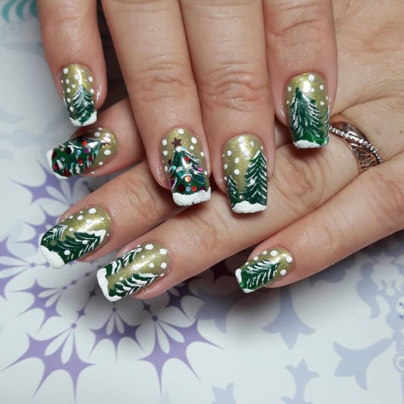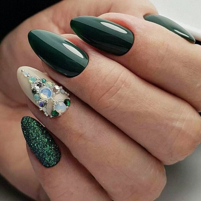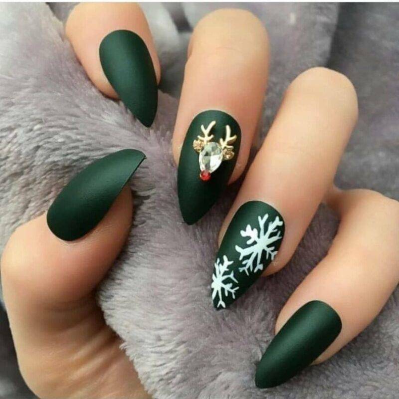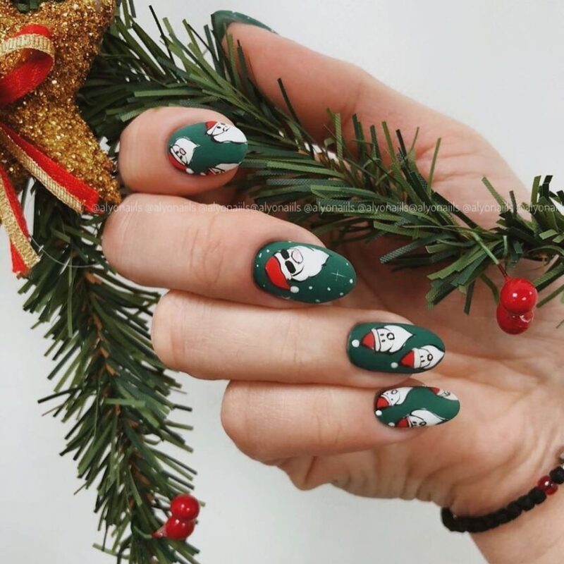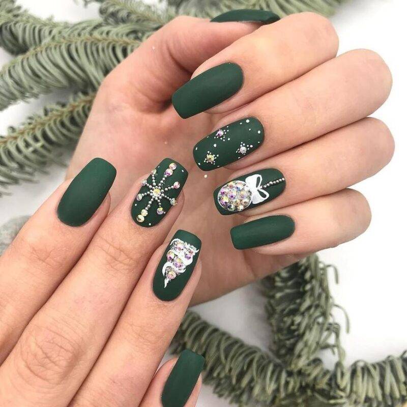 Еще один фаворит в цветовой палитре — зеленый лак для ногтей. Он смотрится глубоко и элегантно. Такой маникюр подойдет дамам любого возраста и статуса. Попробуйте добавить персонажей из сказок, елки или Деда Мороза. Так вы подчеркнете волшебство предстоящего праздника.