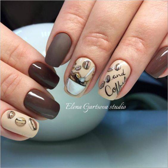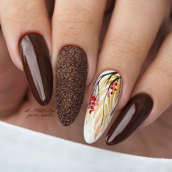Оттенки шоколада является настоящим трендом этого сезона. К тому же теплые коричневые цвета отлично подходят для праздничного французского маникюра. Шоколадные и кофейные оттенки на ногтях создают ощущение тепло, уюта и дома. Если добавить в такой дизайн немного блеска и яркости, то получится невероятно красивый и необычный французский маникюр на Новый год.