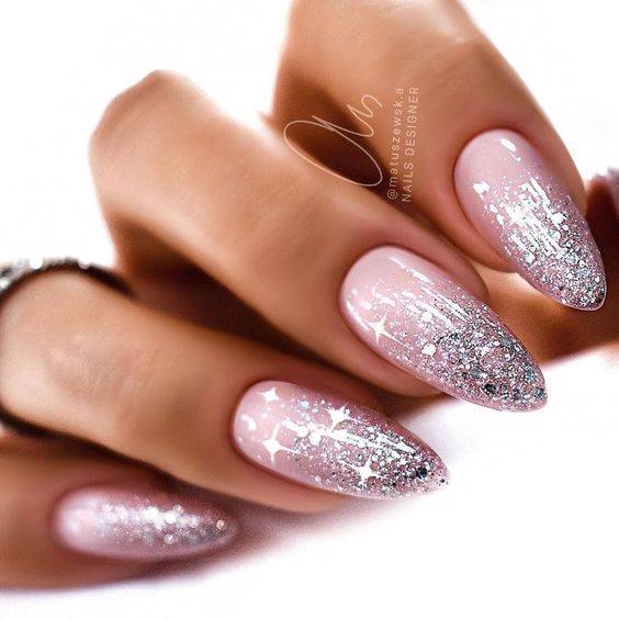 Нежный Новогодний маникюр сделает даже начинающий мастер, с дизайном простого градиента и блестками без использования аэрографа.