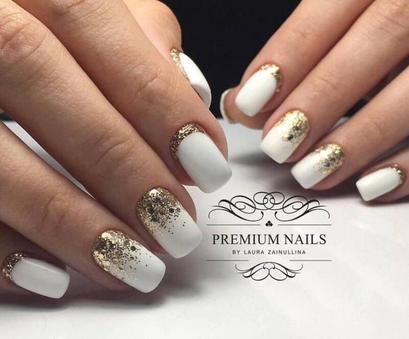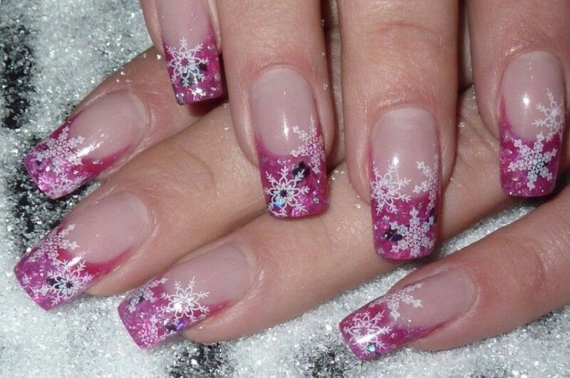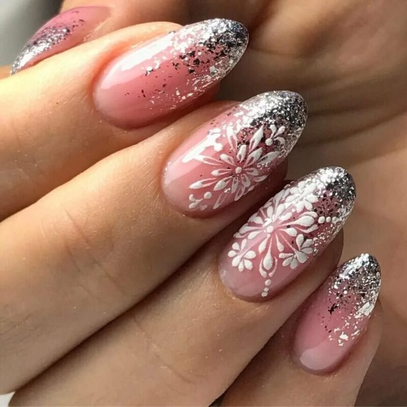 Нежно и модно смотрится классический белый нежный френч в сочетании с блестками и снежинками.