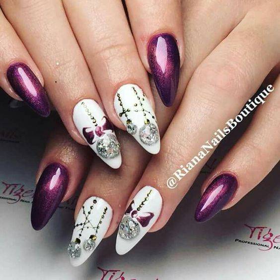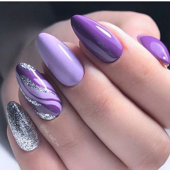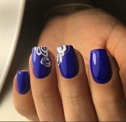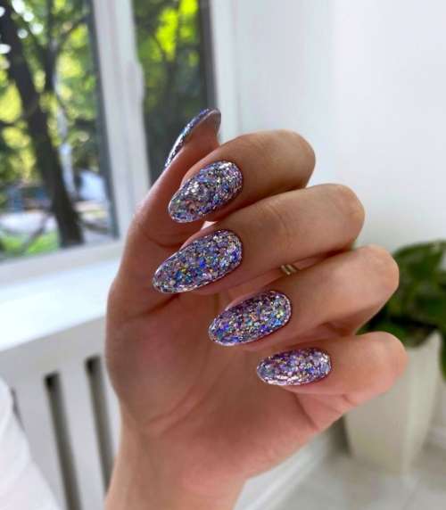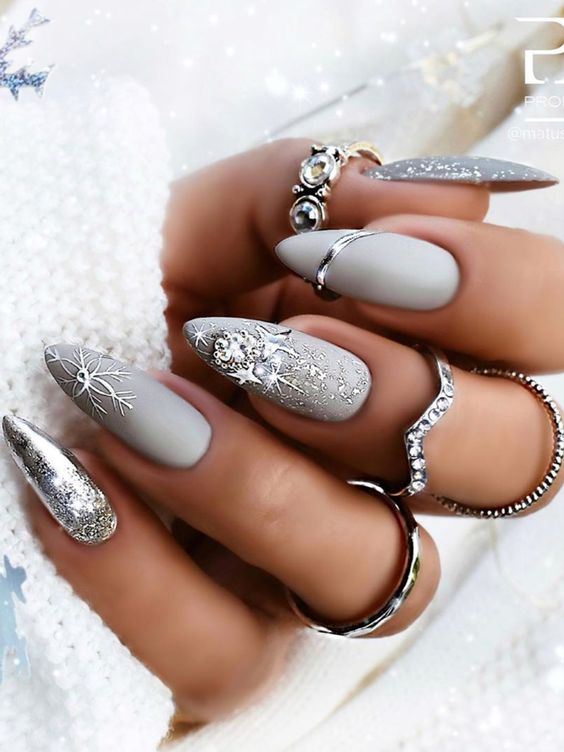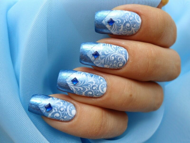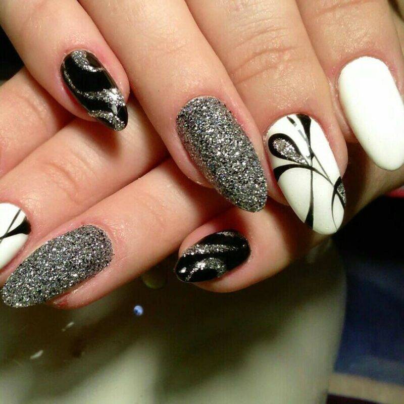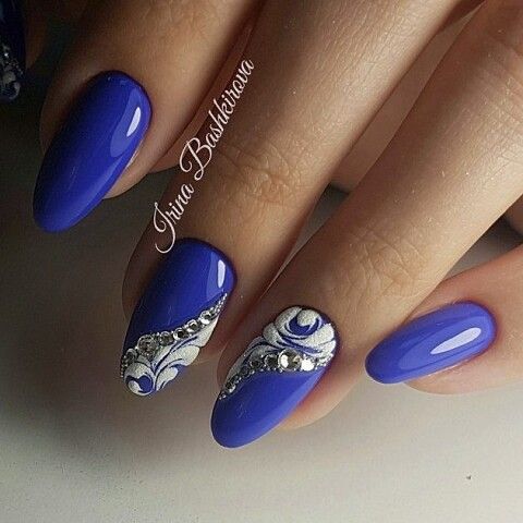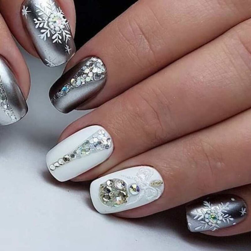 Не менее популярен маникюр в серебристых тонах. Этот лак шикарно смотрится на любой длине и форме ногтей. Попробуйте сделать длинные острые ногти и добавить сверху яркие стразы. Если такой вариант для вас слишком броский, можно выбрать среднюю длину и форму миндаль. Нанесите на ногтевую пластину серебристый лак и добавьте узоры — будет выглядеть сдержанно и одновременно стильно.
